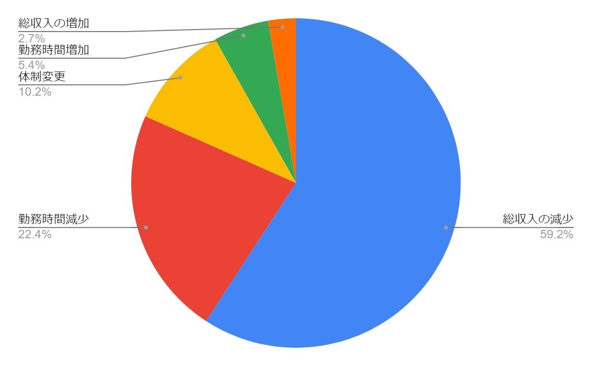 ・総収入の減少が最も多く59.2%を占める。次いで勤務時間減少が22.4%