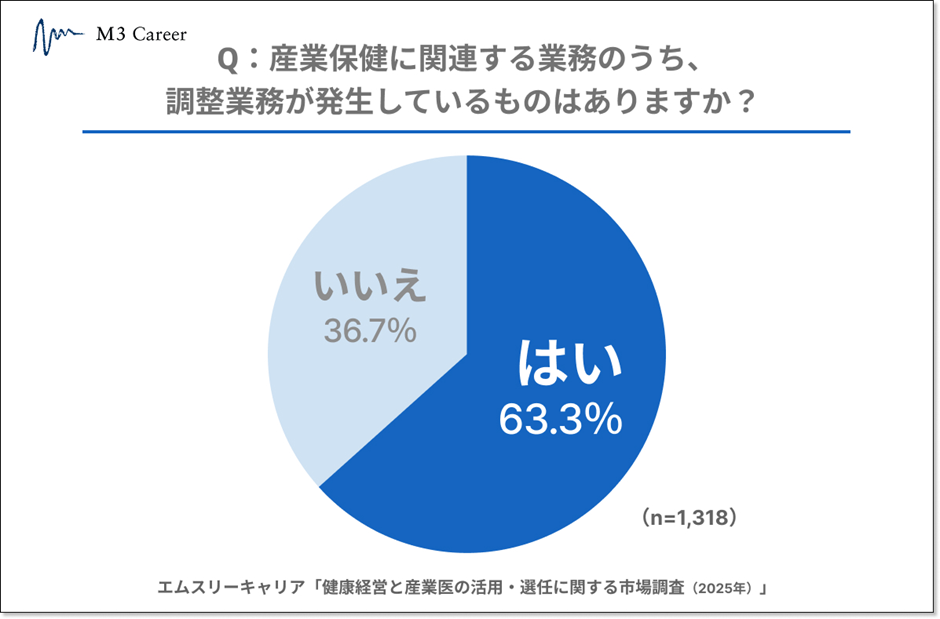 エムスリーキャリアが2025年1月に行った『健康経営と産業医の活用・選任に関する市場調査』では、産業保健に関わる担当者の6割以上が調整業務に追われていると回答しています。