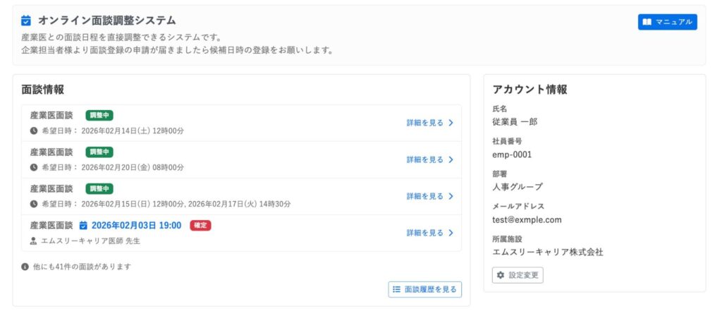 実際、全国各地に拠点を持つ大規模事業場様では、産業医EXPRESSをご活用いただき、2025年度だけで数百件の産業医面談を効率的に実施しており、「産業医EXPRESSを使うことで、面談が先延ばしされることなく、すぐに実施できている」と喜びの声をいただいております。