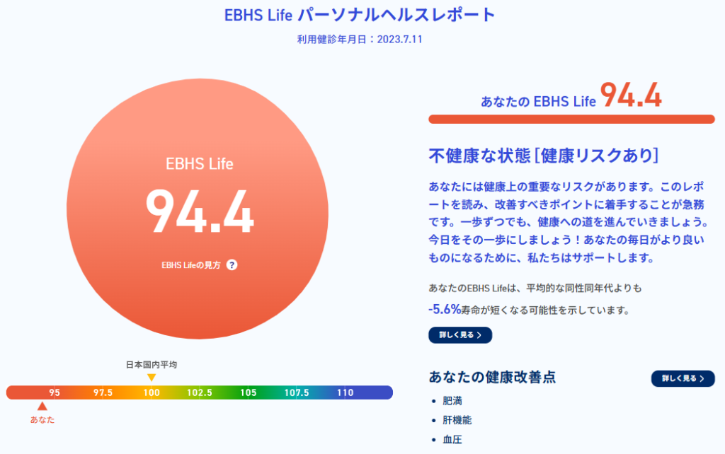 EBHS Lifeは日本人の健康状態と平均余命の関係に注目した指標です。個人の健診結果などのデータから、約5万人分の健診/生活習慣データや寿命予測に関する3,000件以上の論文レビューといった科学的エビデンスに基づき余命予測を算出しています。EBHS Lifeを活用した企業向けレポートでは、企業全体の健康状態の可視化・分析が可能です。特に、健康状態悪化による労働生産性損失額(プレゼンティーイズム)の表示や、ワークエンゲージメントの表示など、今後の経営に求められる指標にも対応しています。